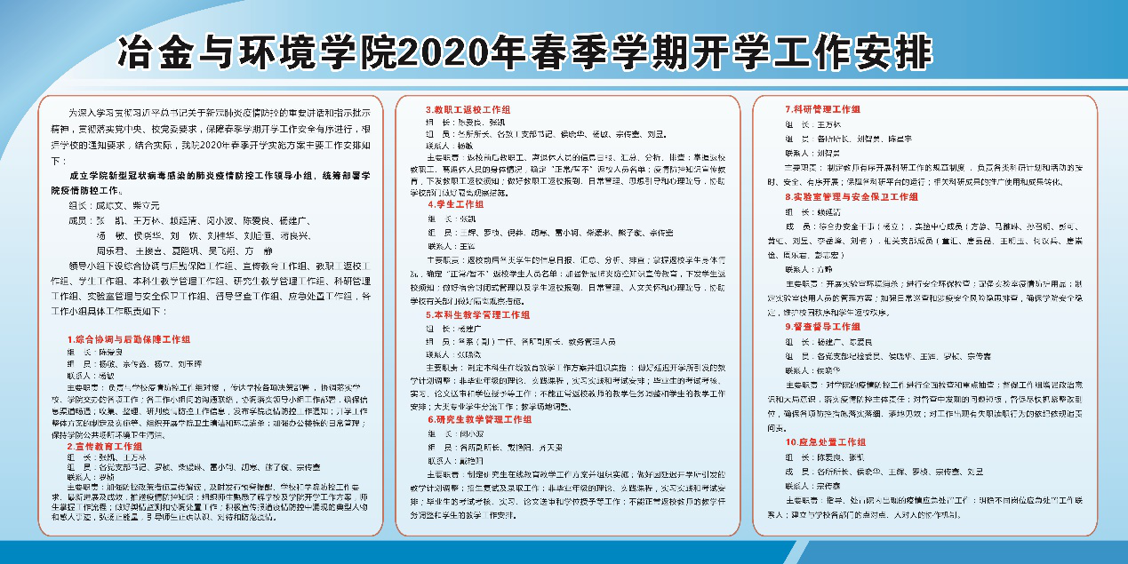 公司成立由院党委书记和院长为组长,各分管院领导、教工支部书记、研究所所长等为组员的学院新冠肺炎疫情防控工作领导小组,统筹部署学院疫情防控工作。领导小组下设综合协调与后勤保障工作组、宣传教育工作组、教职工返校工作组等10个工作小组,明确工作职责、小组成员和联系人,全面部署开学后疫情防控和师生返校工作,做到分工明确,责任到人。