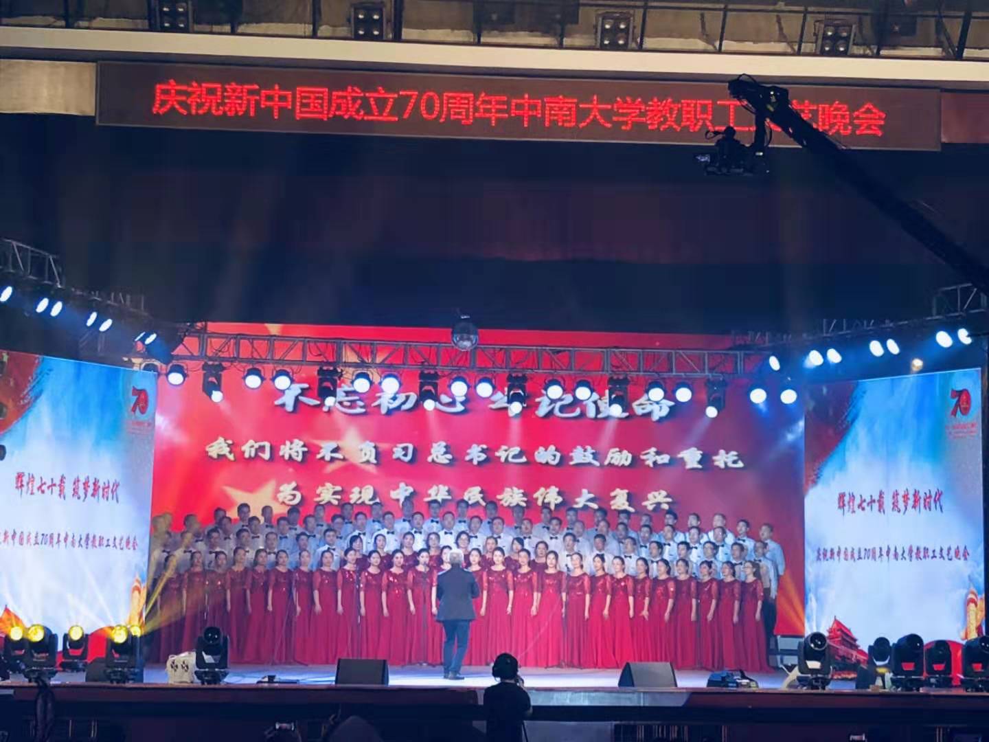 9月27日晚,学校庆祝新中国成立70周年教职工文艺汇演在南校区礼堂举行,学院老师们盛装登场,精神昂扬,指挥肖劲教授西装笔挺,全情投入,倾情演唱《四渡赤水出奇兵》,柴立元院长、成琼文书记全程为教职工们加油打气,“横断山,路难行,天如火来水似银”“亲人送水来解渴,军民鱼水一家人”“毛主席用兵真如神”……舞台上,学院老师们表现优异,将红军战士们的钢铁意志演绎得淋漓尽致,深深地打动了台下观看的师生,出彩的演出赢了现场观众热烈的掌声。节目结束后,学院收到了来自校工会常务副主席陈玉如的祝贺短信,高度赞扬肯定了学院合唱节目的出彩表现!学院教师团结一心,众志成城,以红色经典献礼祖国70华诞。