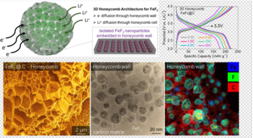 本项工作开发出了溶胶凝胶-高温发泡碳化-低温气相氟化技术,实现了三维蜂窝结构金属氟化铁-碳复合材料的可控制备。研究发现三维蜂窝碳骨架加快了金属氟化物电极内部电子和离子传输,防止了活性材料的溶解,稳定了电化学反应界面。FeF3@C复合材料正极在2.2和5.3 mg cm?2高活性材料负载条件下仍展现出优越的电化学性能,充放电倍率高达100C,不同充放电倍率下1000次循环的容量保持率为85%。相关研究得到了国家青年海外人才项目、公司创新驱动计划项目的支持。