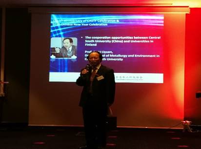 访问团一行后续依次访问了芬兰阿尔托(Aalto)大学化学工程学院和赫尔辛基(Helsinki)大学化学院。在阿尔托大学,柴立元一行参观了火法冶金实验室、湿法冶金实验室和矿物加工实验室,听取了相关教授团队介绍,探讨了联合申请国际项目的方向和可能。柴立元教授指出阿尔托大学冶金专业教育水平领先、科研成果丰硕、实验室建设规范,是我院“双一流”建设合作和学习的榜样,希望芬方教授多访问公司,同时寄语留学阿尔托的冶金学子不忘初心、认真工作、早日学成回国。在赫尔辛基大学,访问团一行参观了化学院实验室,并与相关团队进行了学术交流,讨论了学生联合培养和项目合作上的可能。25日晚,访问团一行受邀参加“芬兰华人科技协会5周年庆典暨新春招待会”,柴立元教授在大会作“A case study---My School, What is going on in Chinese Universities?”主题演讲,反响热烈。中华人民共和国驻芬兰使馆官员、芬兰国会议员及相关政府官员、中芬间进行文化科技工作者的近百名代表参与大会。