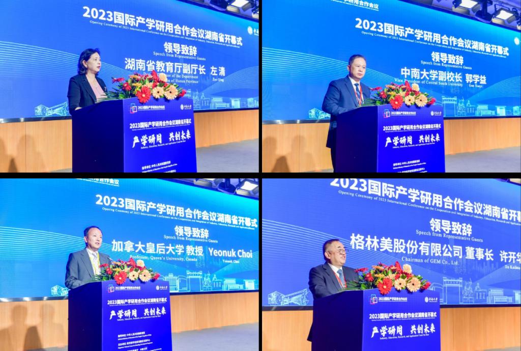 湖南省教育厅副厅长左清、公司副校长郭学益、加拿大皇后大学Yeonuk Choi教授和格林美股份有限公司董事长许开华教授出席开幕式并致辞。左清指出,承办国际产学研用合作会议是湖南省加大教育开放合作的重要机遇和促进产学研深度融合的创新举措,希望各高校、科研院所和企业坚持教育、科技、人才一体推进,加快湖南省丰富科教资源转化为科技创新优势的脚步,为湖南省的经济社会高质量发展注入强劲动力。郭学益表示,公司坚持开放办学,国际合作与交流活跃,在冶金领域深耕细作、成果显著,希望通过产学研用深度合作,积极探索新时代国际产学研用合作新模式,推动全球低碳冶金可持续发展。Yeonuk Choi表示,要促进大学与企业合作取得成功,最重要的是长期的努力和付出。许开华认为,无论世界怎么变化,世界的底色是绿色这一点不会变,人类开发资源的步伐不会变,世界的合作不会变;并表示冶⾦学科要为世界绿⾊服务、为世界新能源服务、为世界科技交流服务。