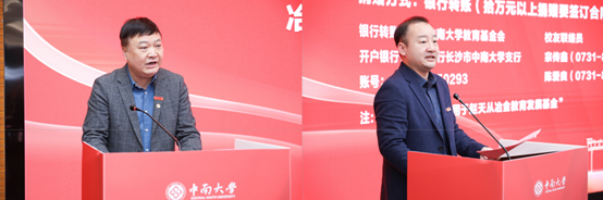 校友代表瑞普兰钧能源股份有限公司董事长曹辉讲话,他感谢母校的培养,中南“知行合一,经世致用”的校训一直在激励自己前行,表示会努力为校友会提供支持平台。