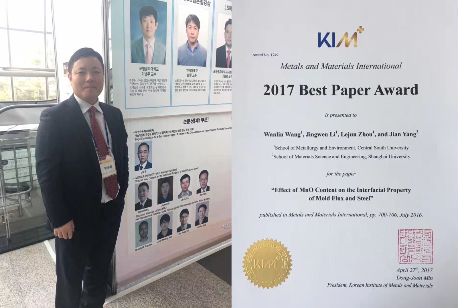 王万林教授团队(第一作者及通讯作者,公司)和时任宝钢股份研究院首席研究员杨健合作的题为“Effect of MnO Content on the Interfacial Property of Mold Flux and Steel”(Met. Mater. Int., Vol.22, No.4, (2016), pp. 700)的论文获得了该学会的“2017年最佳论文奖”;这也是韩国金属材料学会首次将最佳论文奖颁给外国学者。