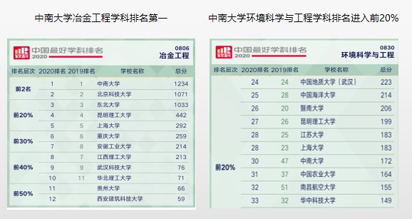 It is worth mentioning that in the ranking of China's best environmental science and engineering disciplines, there are a total of 100 universities on the list. Among them, the ranking of Central South University has risen from 47 in 2019 to 30, entering the top 20%.
