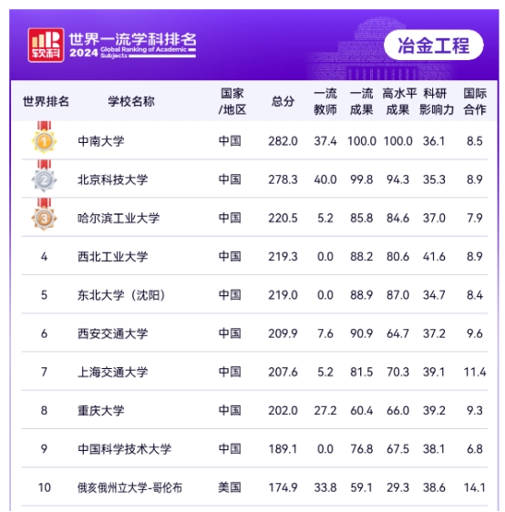 2024软科世界一流学科排名发布,公司冶金工程学科再次登顶